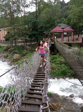 后來天氣稍好之后,我們開始渡過吊橋,前往玄真天溪谷探險(xiǎn)。有些人在步入吊橋的時(shí)候,故意左搖右晃,以期嚇阻膽小的女生。然而陰謀自然是不會得逞的,沒有一位女生是膽小怕事的。想我道可視的女生們個(gè)個(gè)豪情萬丈,堪比木蘭紅玉。