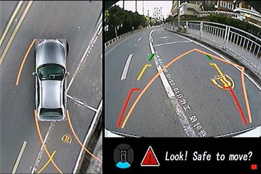 左右側(cè)倒車(chē)輔助線(xiàn)—通過(guò)切換不同視角,可以看到車(chē)前輪與障礙物之間的距離,為車(chē)主通過(guò)提供直接的提示。