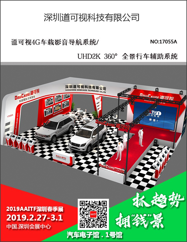 值此辭舊迎新、2019新年開(kāi)春之際,道可視將攜旗下道可視4G車載影音導(dǎo)航系統(tǒng)、UHD2K 360°全景行車輔助系統(tǒng)等360°全景產(chǎn)品,參展將于2019年2月27日~3月1日,在深圳會(huì)展中心舉辦的2019AAITF深圳春季展?。ㄒ韵潞?jiǎn)稱深圳春季展)